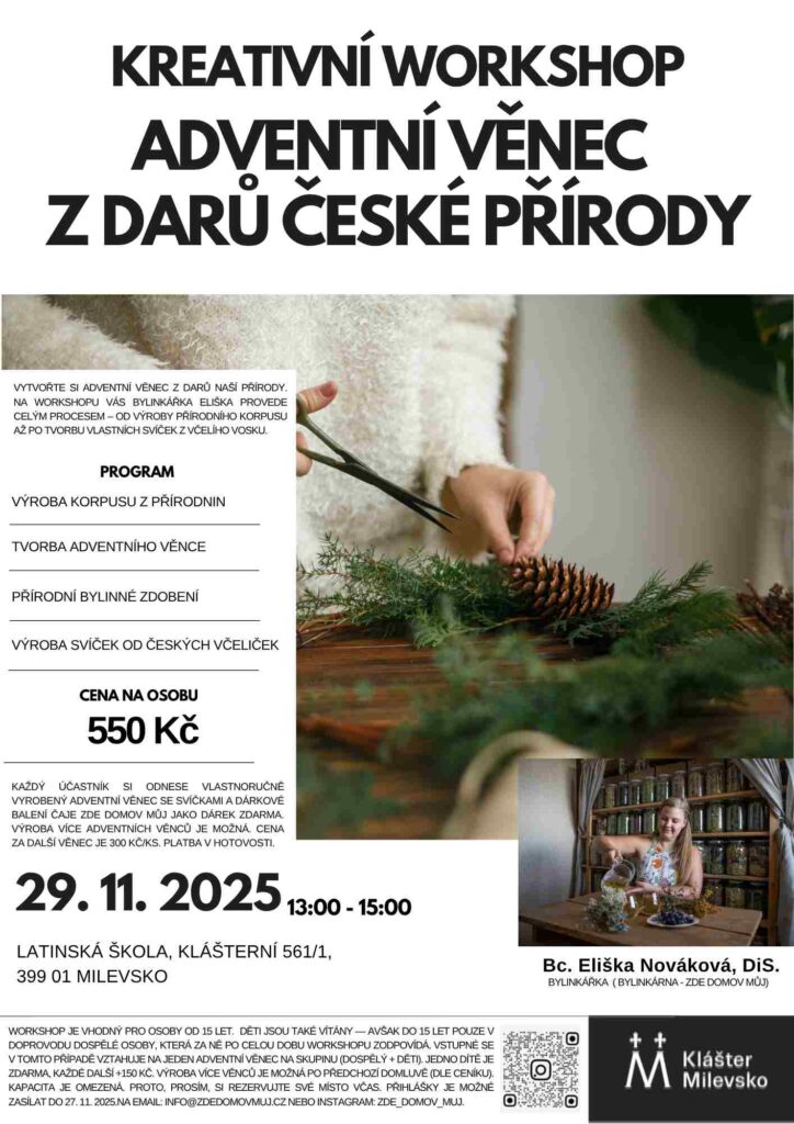 Přijďte si do sálu v Latinské škole vyrobit svůj vlastní, originální adventní věnec plný vůně lesa, mechu, jehličí a dalších darů zimní přírody. Pod vedením bylinkářky Elišky si projdete celý proces – od tvorby přírodního korpusu, přes zdobení větvičkami, šiškami či sušenými plody, až po výrobu vlastních svíček z pravého českého včelího vosku.