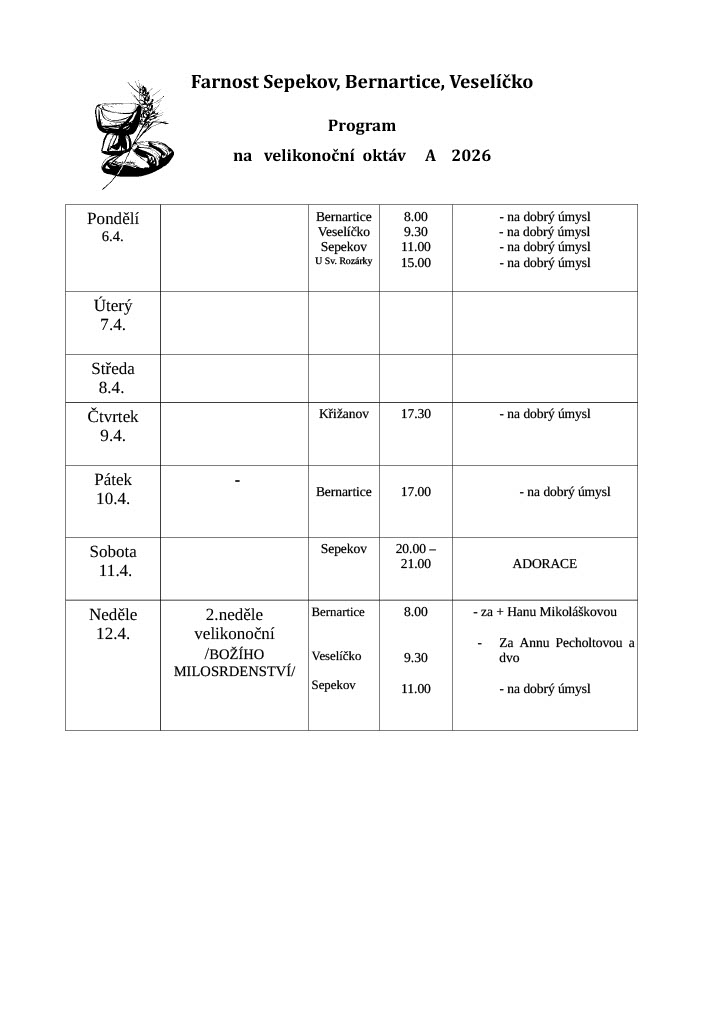 Níže naleznete pravidelný přehled ohlášek pro farnosti Bernartice, Veselíčko a Sepekov v týdnu od 6. do 12. dubna 2026.