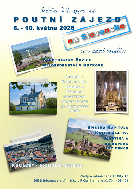 Srdečně Vás zveme na poutní zájezd na Slovensko v termínu od 8. do 10. května 2026. Podrobnosti a přihlášky u p. Quirína na telefonním čísle +420 731 402 403.